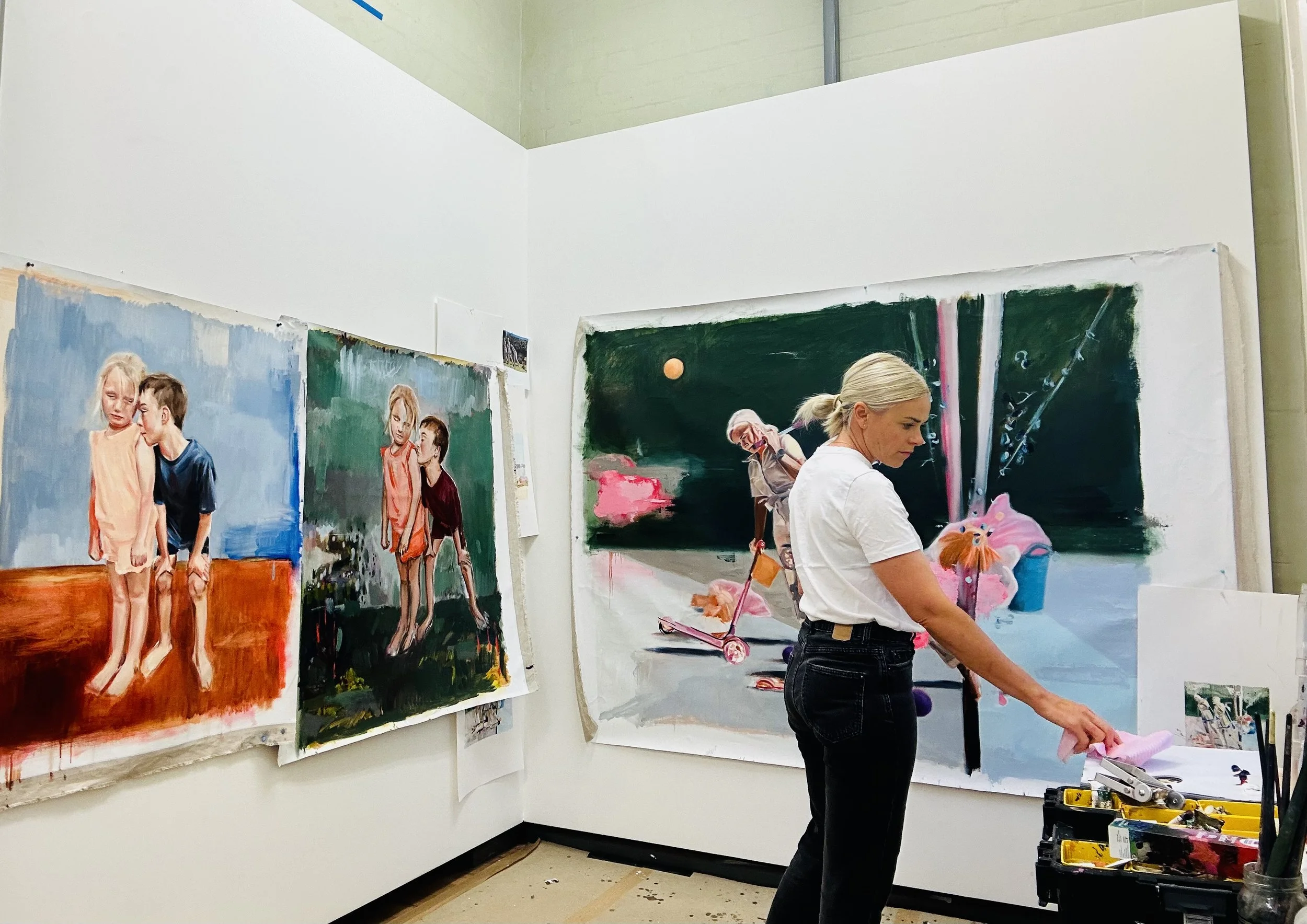 Sibenalers’ work is grounded in the everyday, exploring the transformative potential the ordinary can offer. Centered on the figure and personal relationships, Sibenaler’s work offers connection through personal experience, struggle and her role as an artist’s mother. Sibenaler’s process involves constant shifts in drawing, erasing, applying paint, scraping back, layering and starting again, mirroring the rhythm of daily life. Aimed at capturing a felt moment or sensation remaining from a certain encounter. Each work is unique and invested with time, care and skill.